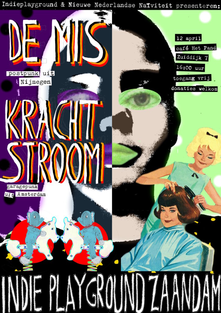 | A G E N D A 12 apr 16:00 PAND – De Mis (postpunk) + KrachtStroom (garagepunk) 10 mei 16:00 PAND – Thor Kissing (weirdo-indie) + Mark Lotterman (lo-fi art folk) + Tino (outsider indietronica) 07 jun 16:00 PAND – The Mono Kids (garagepunk)+ Fac 191 (postpunk) 28 jun 16:00 PAND – Supermarkt (noise punk) + Snackbar (fem-front punk) + Lily Clarisa (poetry) Locatie: Het Pand – Zuiddijk 7 ZAANDAM De Kade – Dam 8 ZAANDAM |
